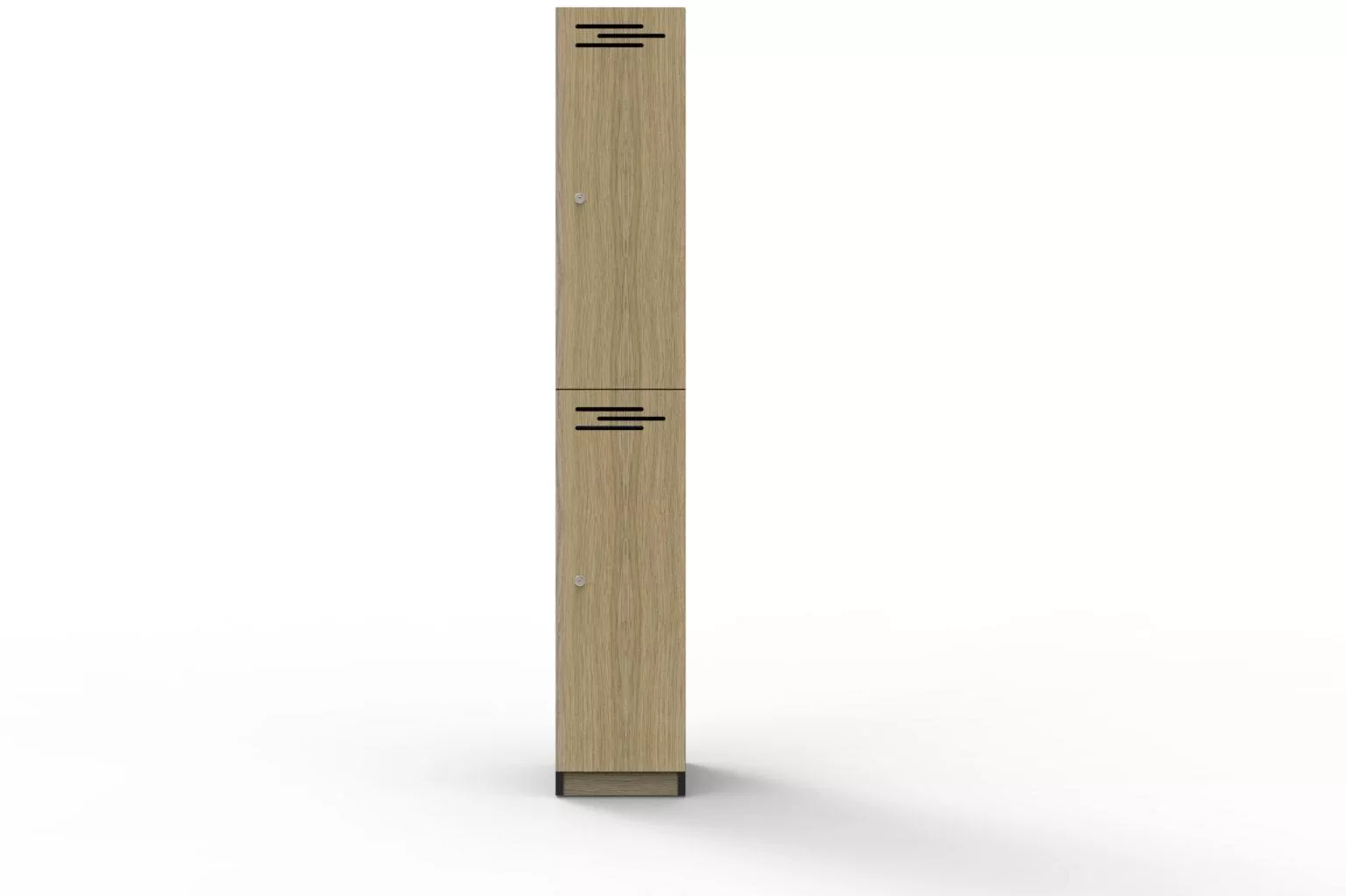 Melamine lockers blend into commercial or educational environments with a choice of natural oak or white finish, with black rigid edging and air vents to doors.