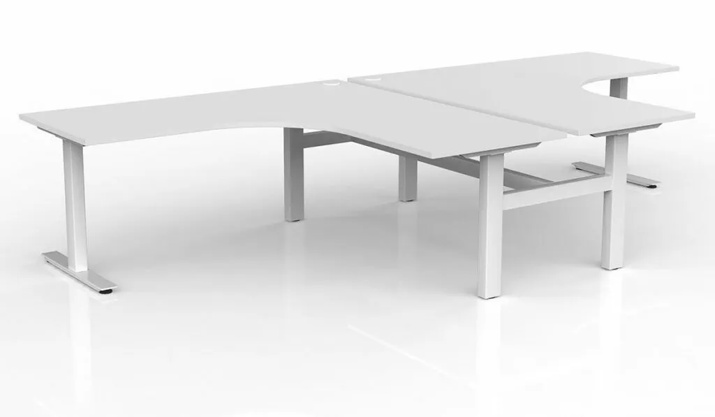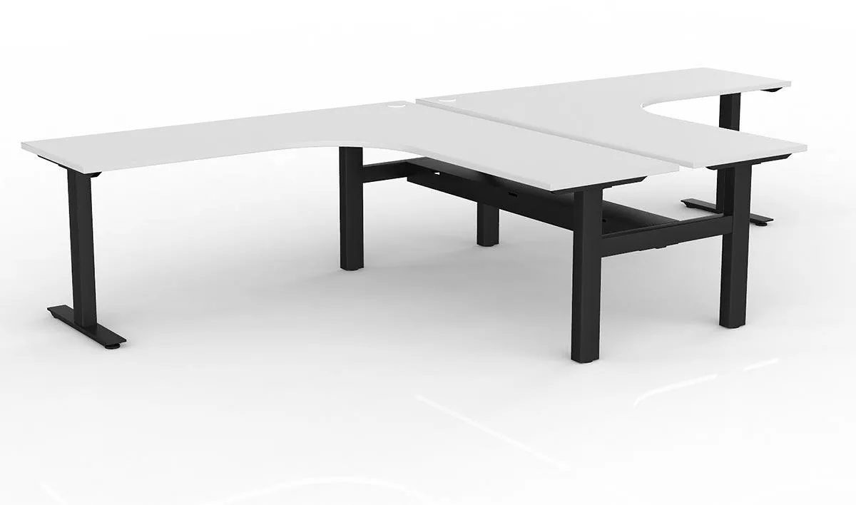 1800mm x 1800mm 90° shared Agile workstation with 2x 600mm deep worktops. Fixed height (715mm) frame finished in white or black powdercoat. 12 Year Guarantee on frame. 100kg weight rating.
