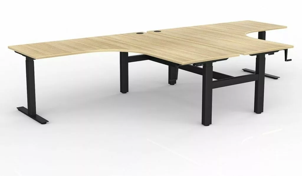 1800mm x 1800mm 90° shared Agile workstation with 2x 600mm deep worktops. Winder height adjust (680mm – 1130mm) frame finished in white or black powdercoat. 12 Year Guarantee on frame and 5 year on motor. 100kg weight rating.