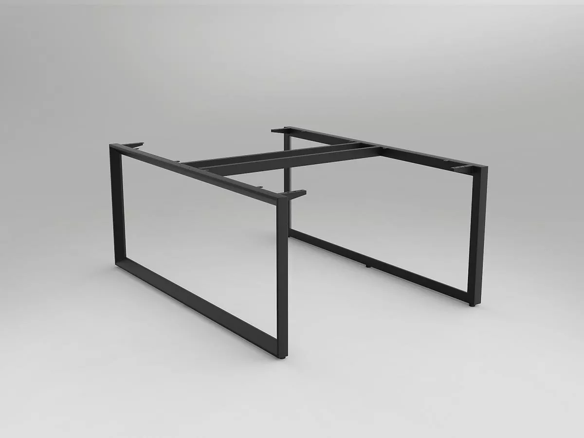 Anvil Shared Doublesided Straightline Desk layout to suit 2 worktops of 1200mm x 750mm. Black Powdercoated Triangle Loop style 50mm x 50mm x 50mm frame, 50mm x 25mm rail. Excludes Worktops, Cable Management and screens.