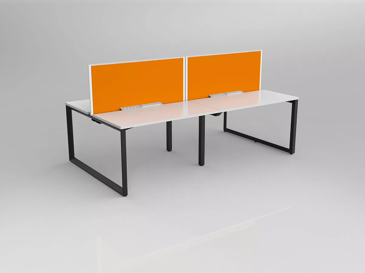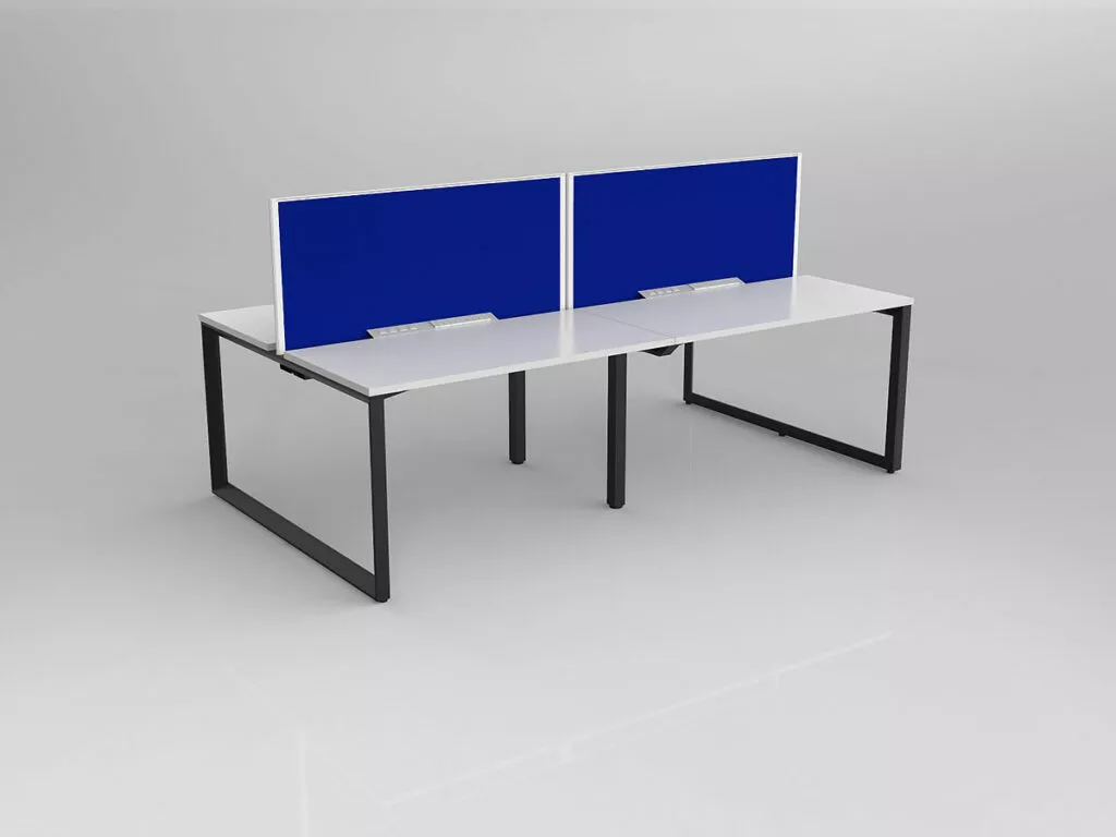 Anvil Shared Doublesided Straightline Desk layout with 4 worktops of 1200mm x 600mm. Black Powdercoated 50mm x 50mm x 50mm triangle frame, 50mm x 25mm rail. 25mm Studio White worktop with ABS edge. Includes solid, segregated cable management trays, above desk power & data service mounting plates to each desktop, solid core central divider screen with Breathe Fabric all over.
