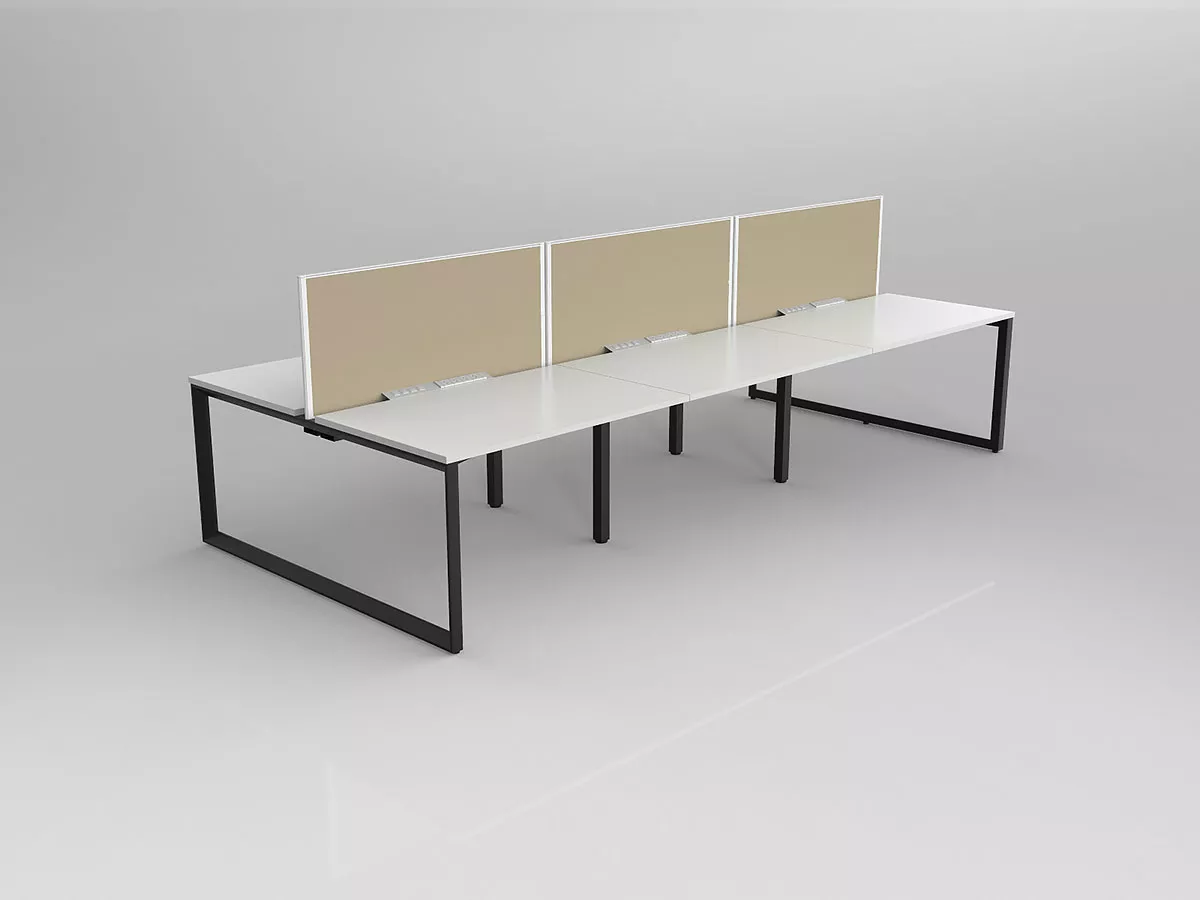 Anvil Shared Doublesided Straightline Desk layout with 6 worktops of 1200mm x 750mm. Black Powdercoated 50mm x 50mm x 50mm triangle frame, 50mm x 25mm rail. 25mm Studio White worktop with ABS edge. Includes solid, segregated cable management trays, above desk power & data service mounting plates to each desktop, solid core central divider screen with Breathe Fabric all over.