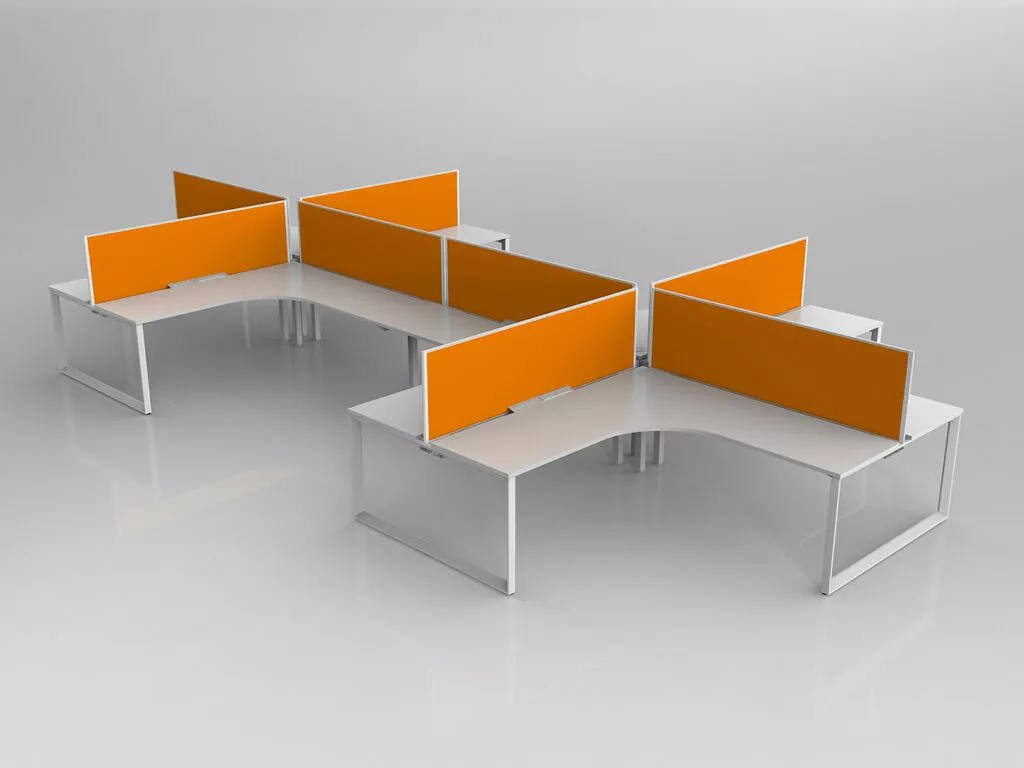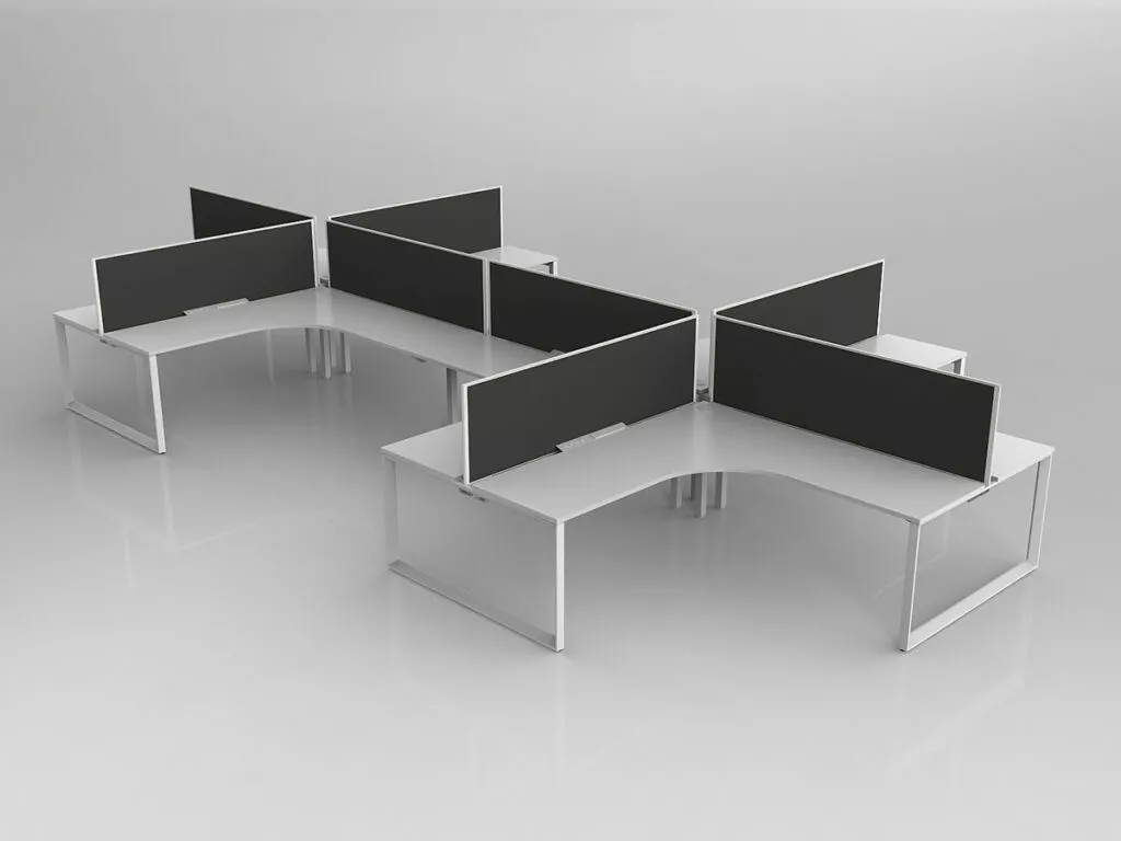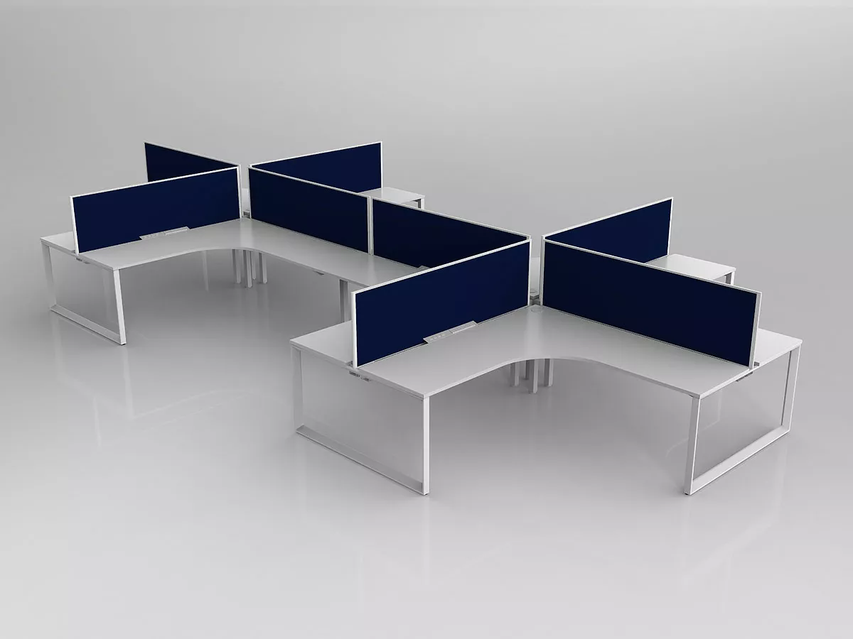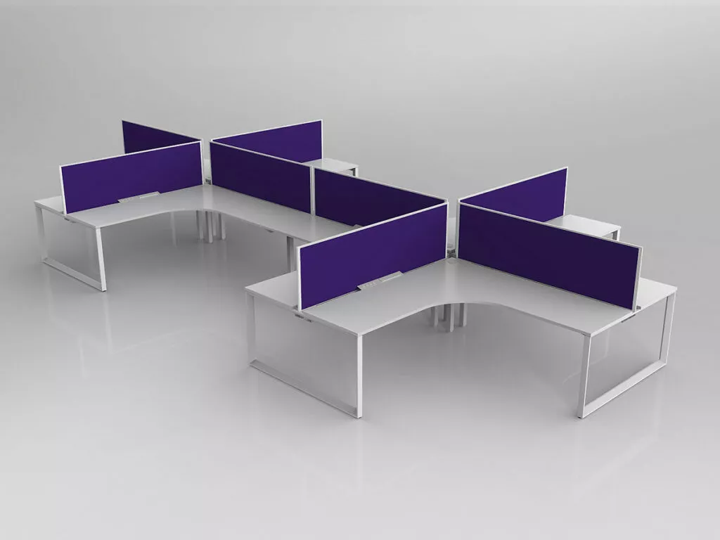 Anvil Shared 90 degree workstation Plus layout with 8 worktops of size 1800mm x 1800mm/600mm. White Powdercoated 50mm x 50mm x 50mm triangle frame, 50mm x 25mm rails . 25mm Studio White worktop with ABS edge. Includes solid, segregated cable management trays, above desk power & data service mounting plates to each desktop, solid core central divider screen with Breathe Fabric all over.