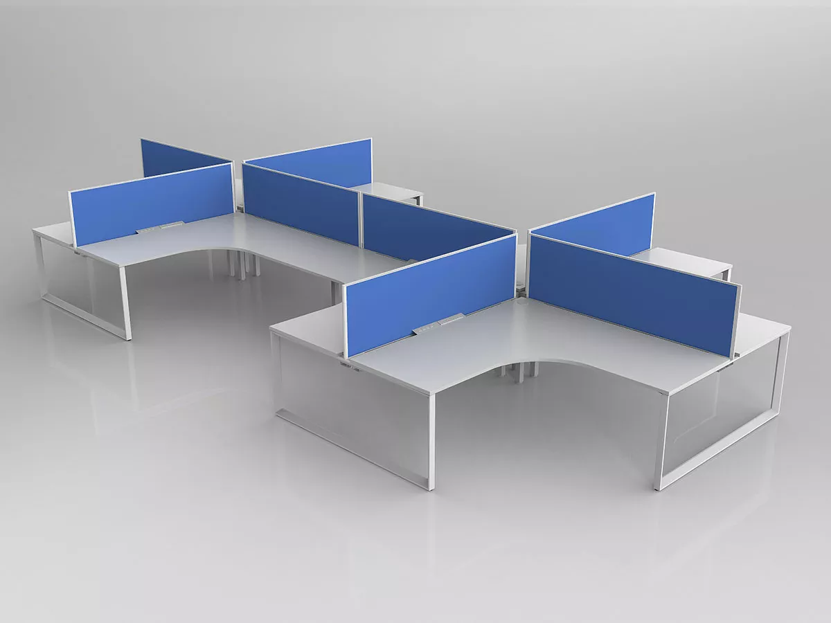 Anvil Shared 90 degree workstation Plus layout with 8 worktops of 1800mm x 1800mm/750mm. White Powdercoated 50mm x 50mm x 50mm triangle frame, 50mm x 25mm rails . 25mm Studio White worktop with ABS edge. Includes solid, segregated cable management trays, above desk power & data service mounting plates to each desktop, solid core central divider screen with Breathe Fabric all over.