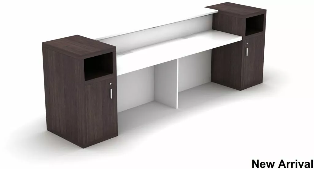 Sophisticated and versatile with ample storage space. Front panel in white with a lockable side storage cupboard unit with book shelf on each side in dark chocolate brown. Hob in jade white stone, desktop in gloss white and an stainless steel kick plate.
