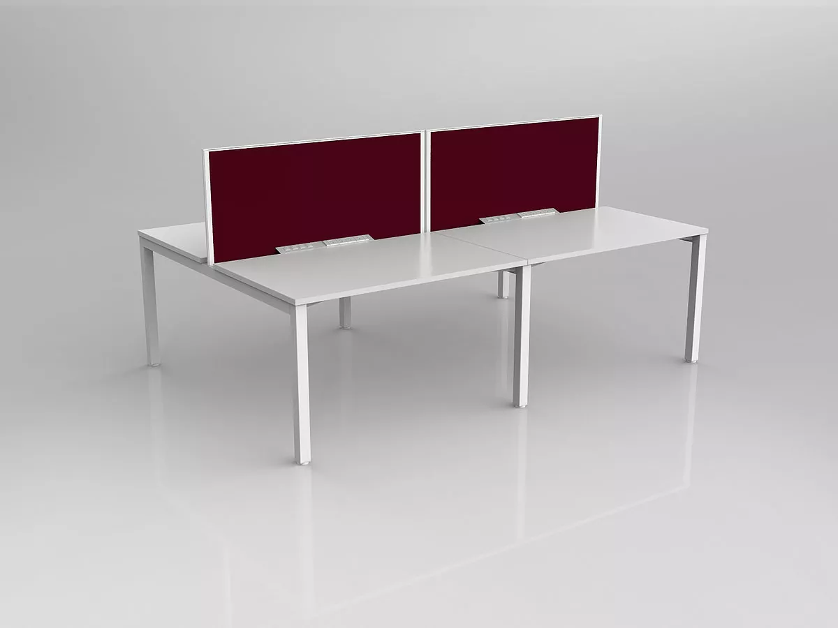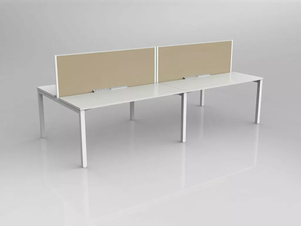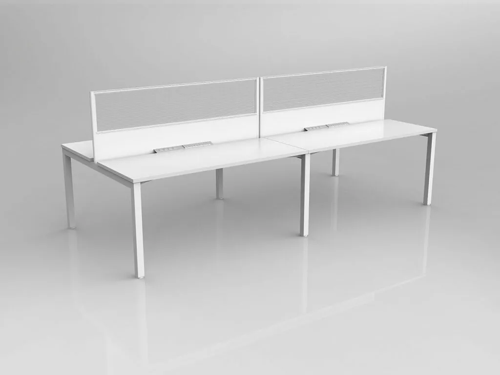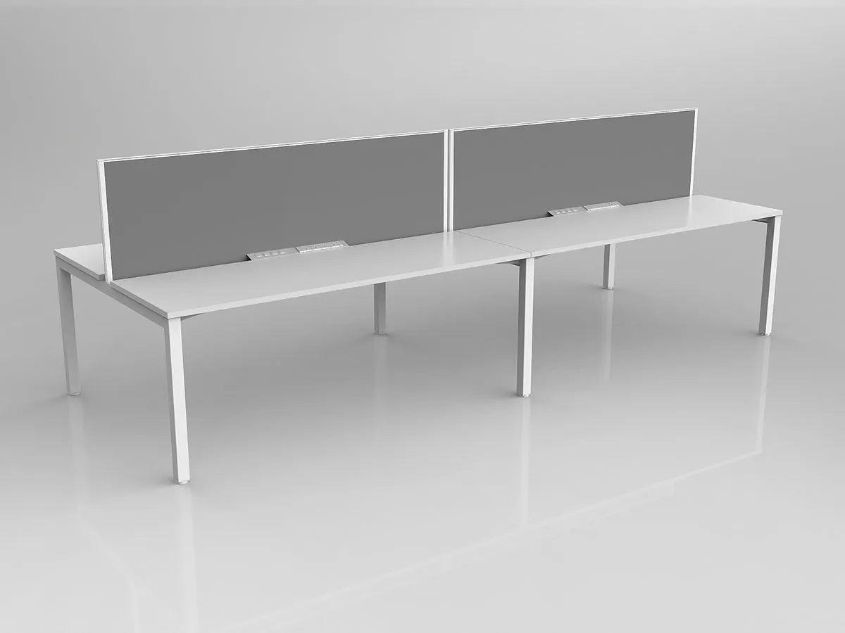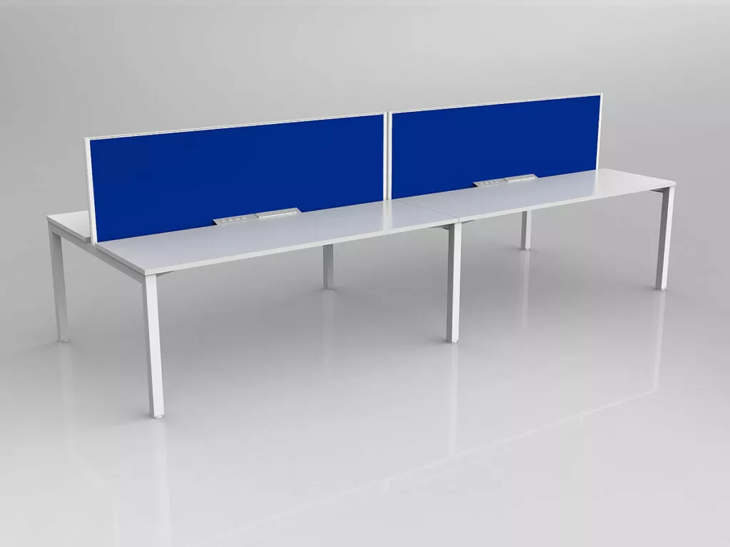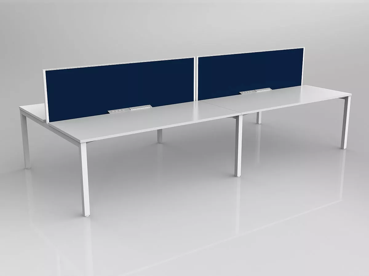 Axis Shared Doublesided Straightline Desk layout with 4 worktops. White Powdercoated 50mm x 50mm frame, 50mm x 25mm rail, 80mm height adjustment in each foot. 25mm Studio White worktop with ABS edge. Includes solid, segregated cable management trays, above desk power & data service mounting plates to each desktop, solid core central divider screen with Breathe Fabric all over.