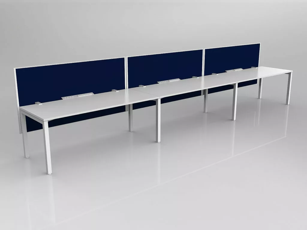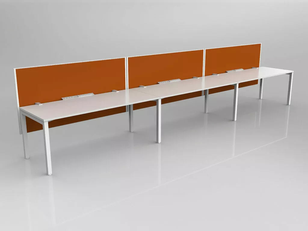 Axis Shared Singlesided Straightline Desk layout with 3 worktops size of 1800mm x 750mm. White Powdercoated 50mm x 50mm frame, 50mm x 25mm rail. 25mm Studio White worktop with ABS edge. Includes solid, segregated cable management trays, above desk power & data service mounting plates to each desktop. 900high offset hung screens (1200FFL) solid core with breathe fabric all over.