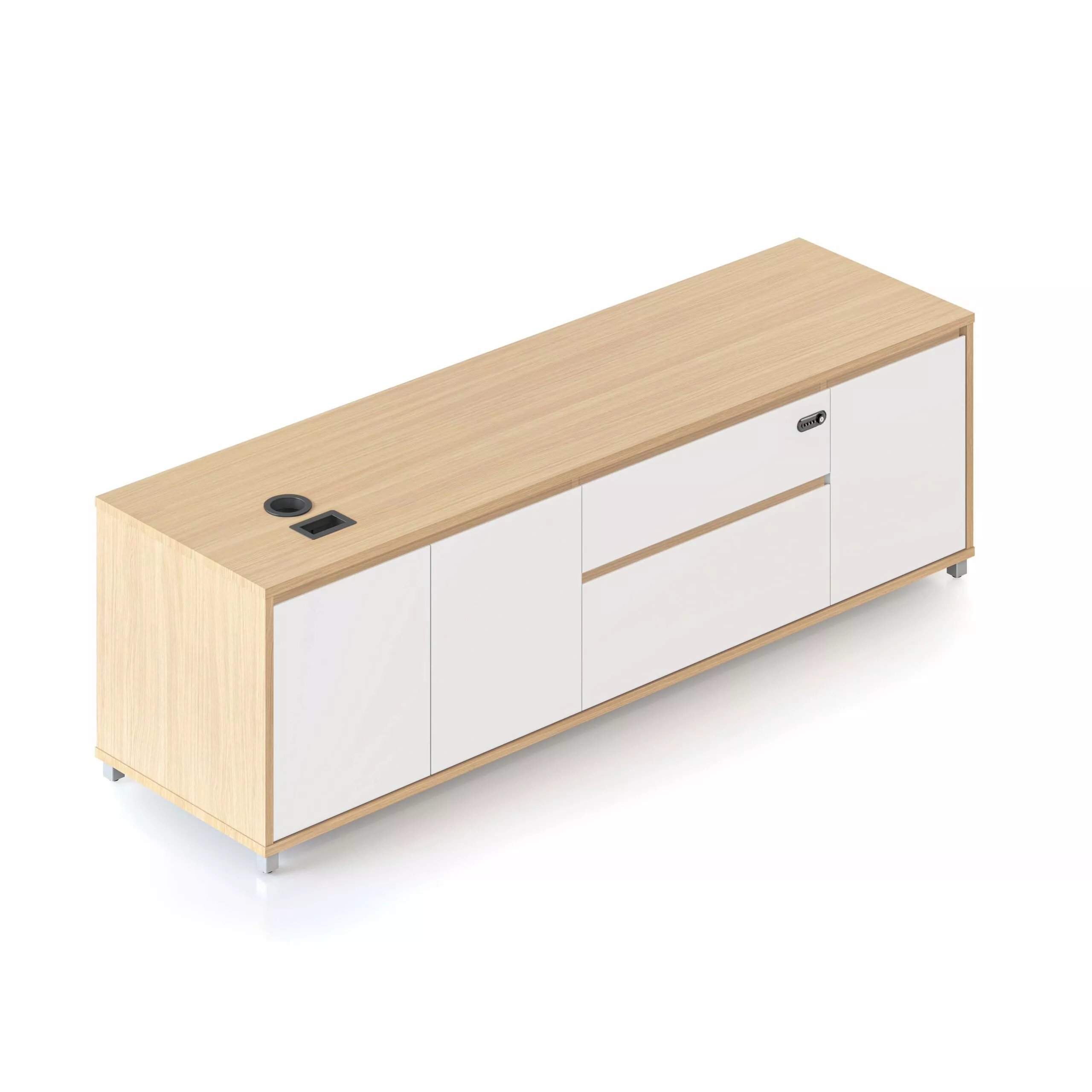 Classic Evolution styled 2 door cabinet, finished in zebrano timber veneer with white doors.