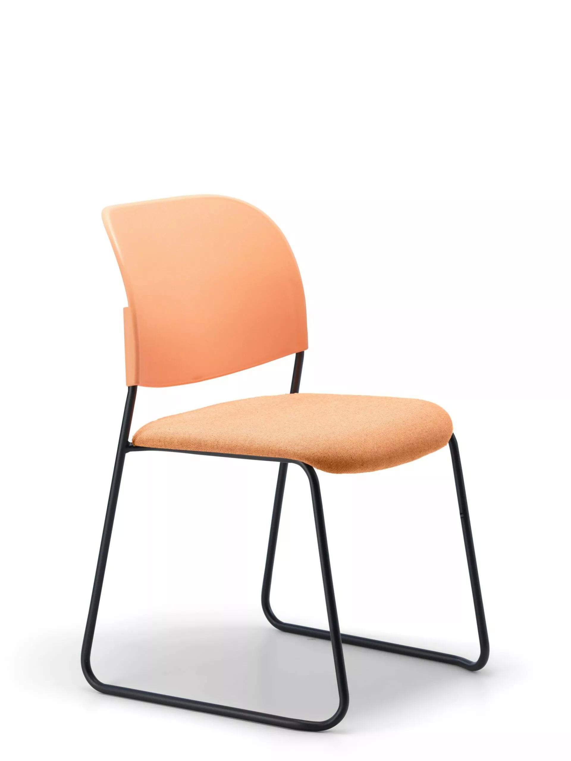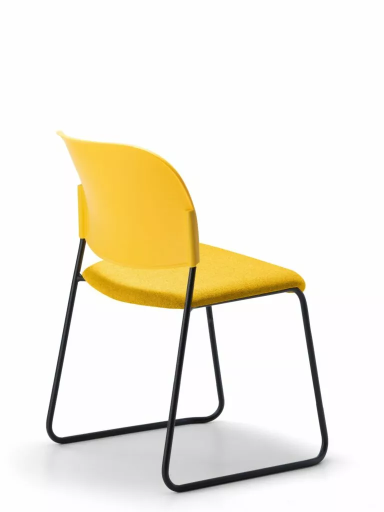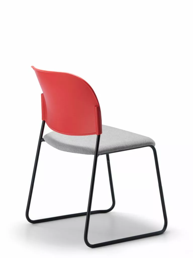 The upholstered seat version stacks 12 high on floor and 25 high on trolley.