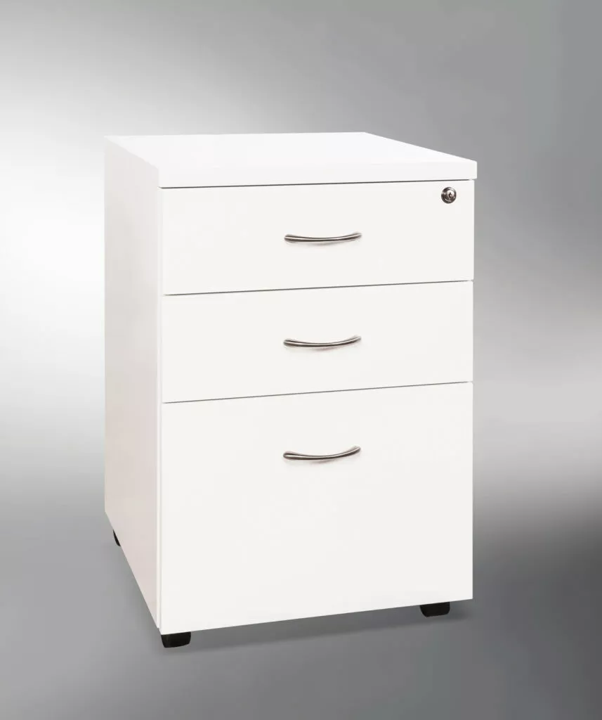 Mobile Pedestal, 2 pencil drawers and 1 filing drawer, with multi lock. Finished in high quality 2 pack paint in super gloss white.