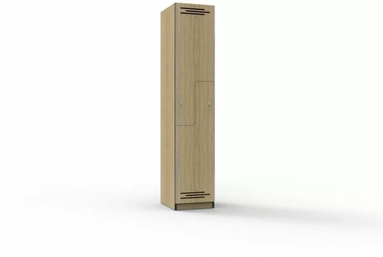 Melamine lockers blend into commercial or educational environments with a choice of natural oak or white finish, with black rigid edging and air vents to doors.