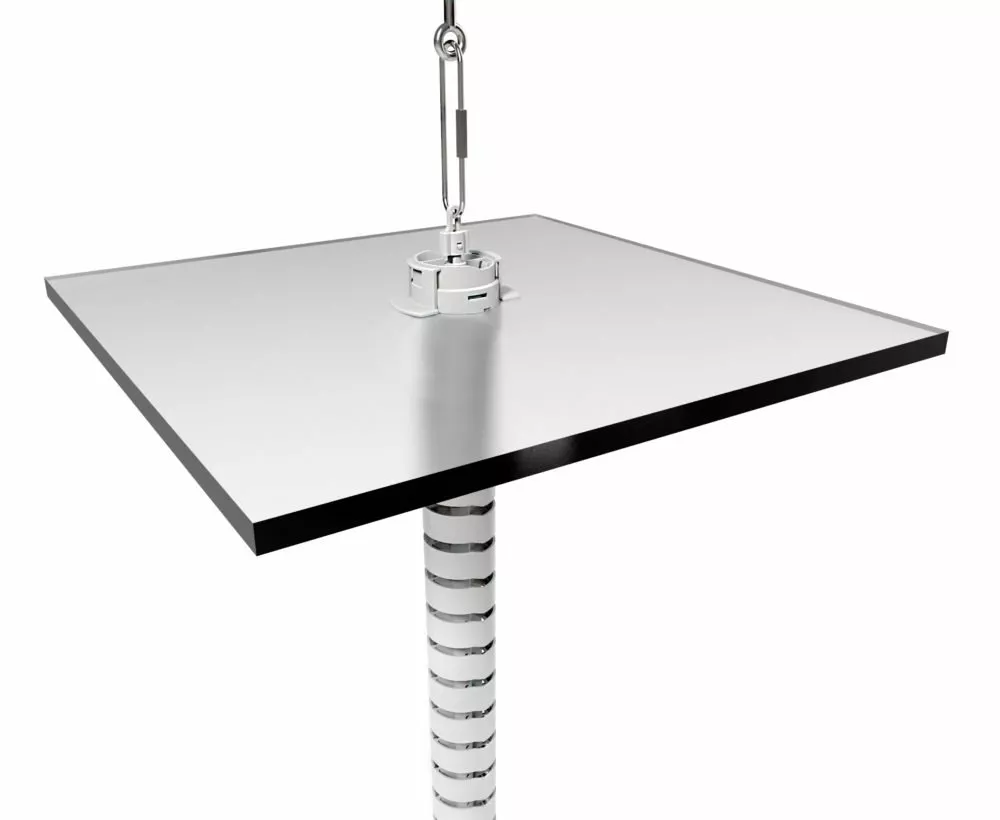 The umbilical power pole is a flexible and attractive way of carrying wires from the ceiling to a cable basket or above desk power.